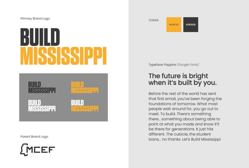 We created Build Mississippi, an action-oriented brand platform to serve as the outward face of MCEF. In addition to naming and strategy, I developed a new logo and brand identity system, created a mission-driven messaging platform to connect with students, families, and industry partners, and led our team to create unified campaign materials across digital, social, and live event environments. We also built this guy: buildmississippi.com
