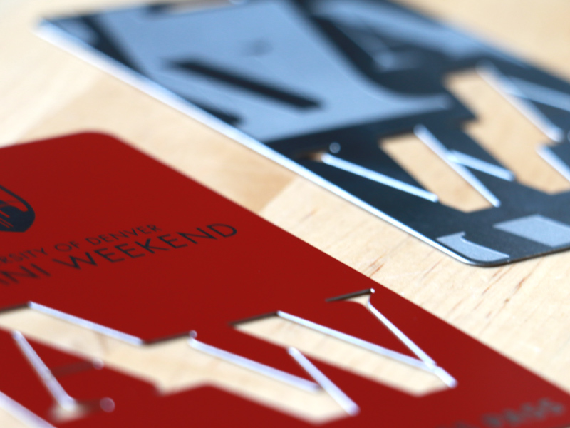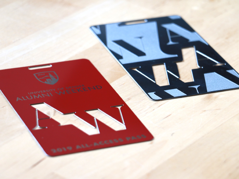 As supporting collateral for the of the Alumni Weekend brand I developed, we also needed an all-access pass. Printed in and on stainless steel.